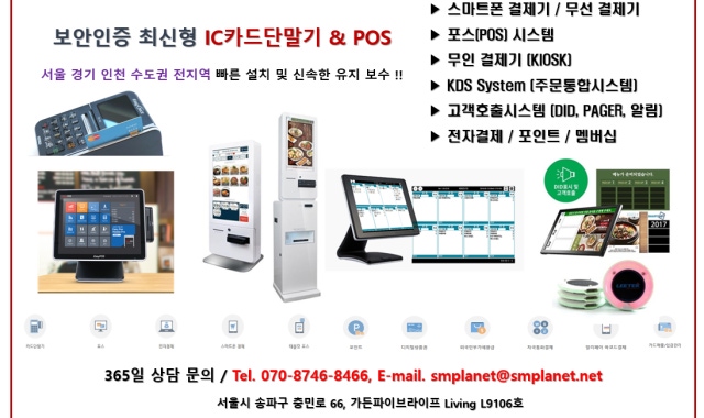 카드 단말은 이동식 카드 결제기뿐만 아니라 유선 단말기, 포스 단말기, 키오스크 등 다양한 제품군이 존재하기 때문에 고객의 사업장에 맞는 제품을 설치하는 것이 중요합니다.저희 신신엠엔씨에서는 다양한 제조사의 다양한 기종을 취급하고 있으며, 고객님의 사업장과 규모, 카드결제 건수 등에 따라 적합한 제품으로 설치가 가능하며 여신금융협회로부터 인증받은 정식 IC단말기만 취급하고 있으며 중고나 저가형 모델이 아닌 단지 새로운 제품으로 설치가 가능합니다.